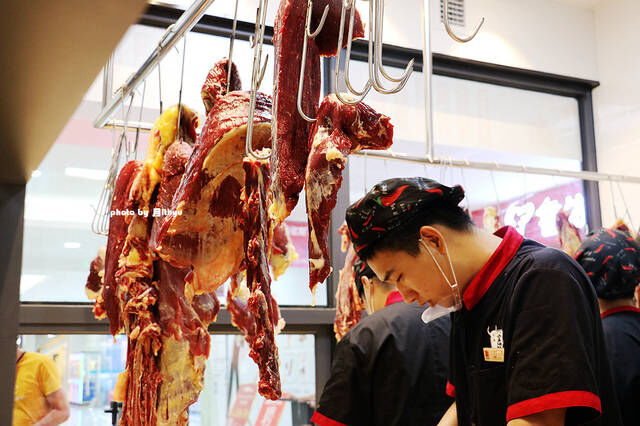 万科里店,有着小三层,一入门依然是现切鲜牛肉的地方,一整排的牛肉真是非常的诱人。还未七点已经排很多人,这间店铺在装修上更可爱,墙面挂上了卡通牛,好似有着童趣;以四人座为主,仅有一间包厢,如果人多真的要看运气了。