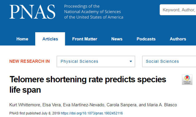 端粒是真核细胞内染色体末端的DNA重复片段,功能是完成染色体末端的复制,防止染色体融合、重组和降解。以往的研究表明,端粒与衰老过程有关。由于每次细胞繁殖以修复损伤时,端粒就会变得更短。因此,有学者猜测,物种的寿命也和端粒长度之间存在某种关联。