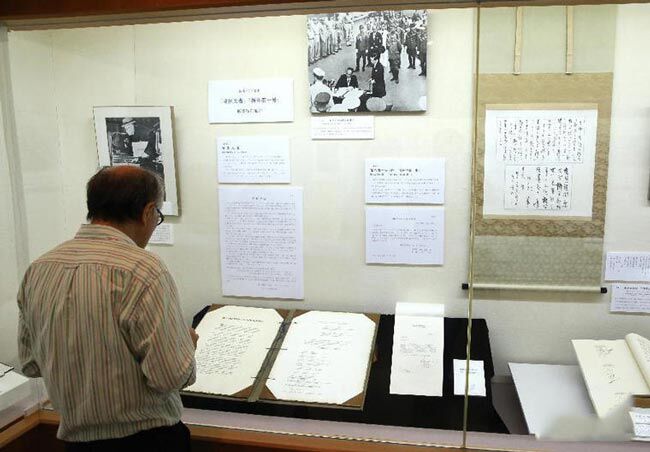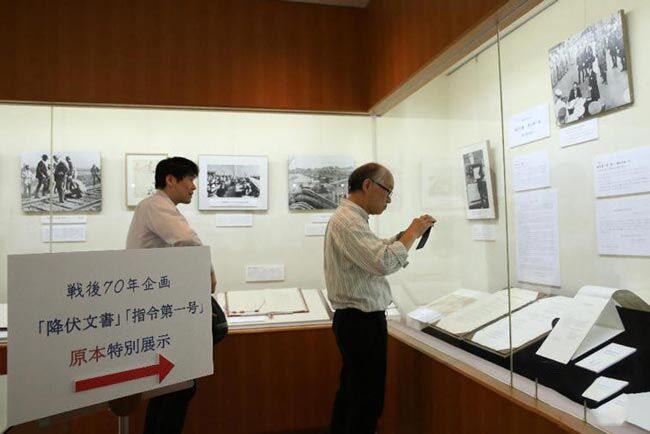 9月1日,在日本东京外务省外交史料馆,参观者观看日本二战无条件投降书原件。