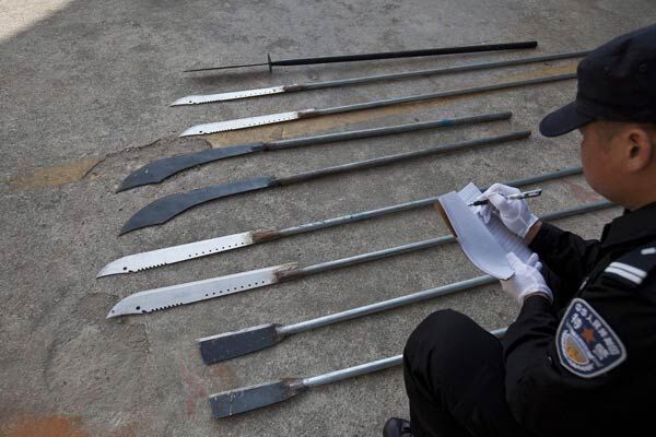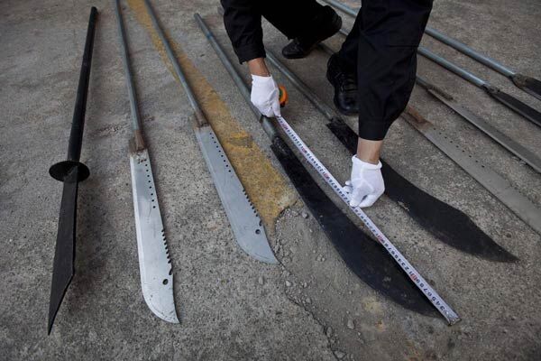10月27日,湖南汨罗,巡警大队民警正在清点缴获的管制管制刀具。25日晚8时许,汨罗市一公园内20余名社会青年手持大刀对阵,流血械斗一触即发。接到群众报警后,巡警迅速赶赴现场,聚众者四散逃逸。