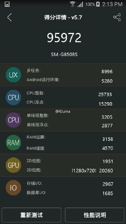 来自微博的截图显示,一款型号为SM-G8508S的三星手机跑分结果为95792分。作为对比,当前的GalaxyNote5不到70000分。因此,这款手机采用的芯片组要比Exynos7420更强大。