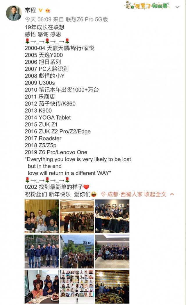在这条微博中,常程列举了关于他从 2000 年到 2019 年的点点滴滴,并说 “19 年成长在联想,感悟、感谢、感恩”。