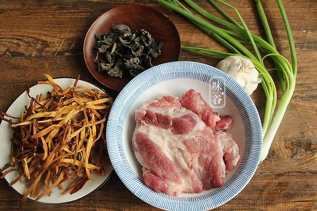 【材料】:黄花菜 70克、干木耳10克、猪肉(半肥瘦)200克、黄豆酱1汤匙、老抽半汤匙、糖半茶匙、盐半茶匙、淀粉1茶匙、生抽半汤匙、蒜适量、葱白适量