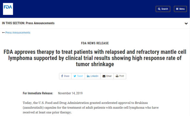 2019 年 11 月 14 日,美国食品药品监督管理局(FDA)加速批准了百济神州研发的 BTK 抑制剂 BRUKINSA™(通用名:zanubrutinib,泽布替尼)上市,用于治疗既往接受过至少一项疗法的成年套细胞淋巴瘤(MCL)患者,预计未来几周内将在美国正式进行销售。