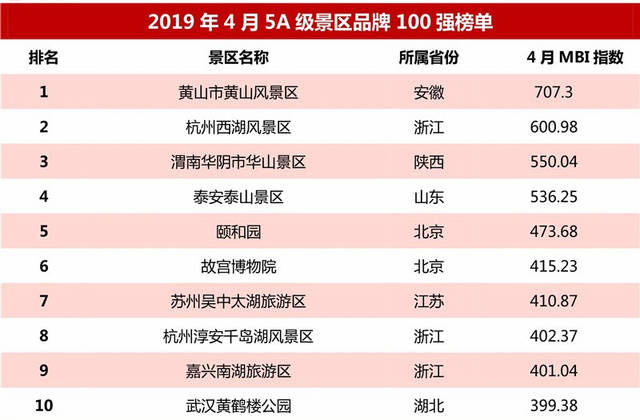据“2019年4月5A级景区品牌100强榜单”显示,进入榜单前十的景区分别是:黄山市黄山风景区、杭州西湖风景区、渭南华阴市华山景区、泰安泰山景区、颐和园、故宫博物院、苏州吴中太湖旅游区、杭州淳安千岛湖风景区、嘉兴南湖旅游区、武汉黄鹤楼公园。