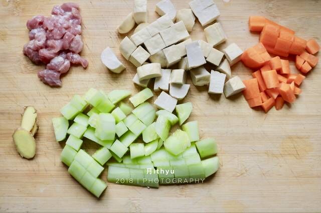 胡萝卜三分之一、黄瓜一半、安溪豆干一块(有咸味)、肉丁少许(从排骨上切了些肉来搭配),全部切成丁备用。
