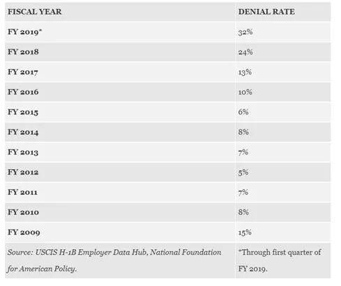 自从川普上台之后,各项严格的政策导致H-1B申请遭拒的比率显著上升。根据美国移民局数据,H-1B拒签比例从2015年的6%到2019年的32%,只用了短短三年的时间便上升了四五倍。