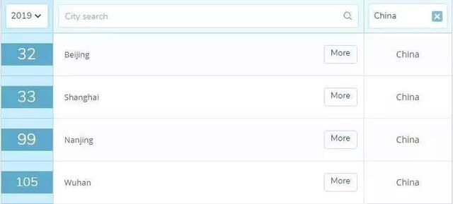 此次中国共有7个城市入榜,其中大陆有4个,分别是北京(32)、上海(33)、南京(99)、武汉(105);台湾地区有2个城市,分别是台北(17)、新竹(68),以及香港(14)。排名最高的城市是香港。