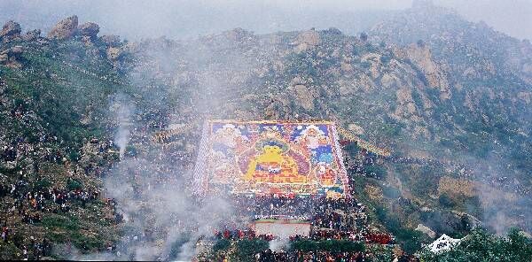 多年来,展佛都是节日的序幕,作为序幕,哲蚌寺的展佛是最令人瞩目的仪式。清晨,哲蚌寺背后的半山腰上早早就挤满了人群,只为等待在第一缕曙光的辉映下,伴着法号声,一幅500平方米左右的巨大释迦牟尼像徐徐展露出祥和的容颜。因为雪顿节期间,有规模盛大的晒佛仪式,所以当地大多数人把雪顿节称之为“晒佛节”。