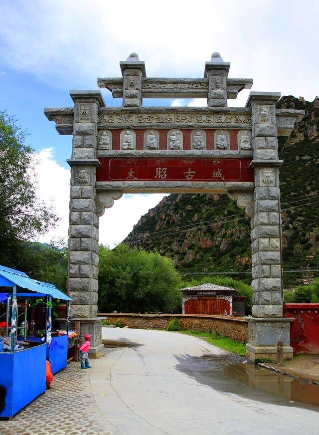 太昭古城位于318国道旁,地处工布江达县城西面,距县城20公里。未入古城,镌刻有“太昭古城”的牌坊先入视野,高大挺拔的背后是历史的厚重与深邃。