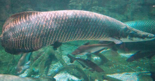 5、巨骨舌鱼:巨骨舌鱼就是堪称活化石的一种大型淡水鱼,主要生活在亚马逊流域,成年鱼有2到6米长,体重可达100千克。巨骨舌鱼虽然行动缓慢,却拥有很强的弹跳力。它们为了适应环境的变化,早就衍生出了直接吞咽空气来呼吸的能力。