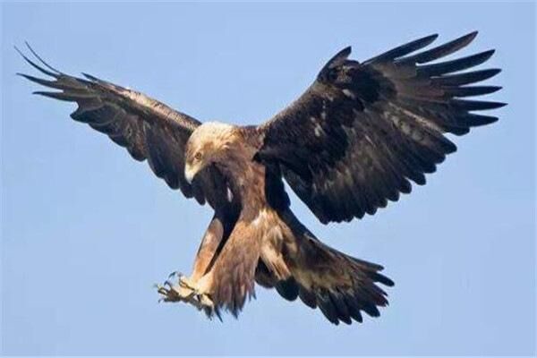 6、金雕:金雕是北半球上一种广为人知的猛禽,成鸟的翼展平均超过2米,体长则可达1米,其腿爪上全部都有羽毛覆盖著。主要捕食野兔、旱獭、雉鸡、鹑类等。有时也攻击狍、野猪幼体等动物,也吃大型动物尸体。