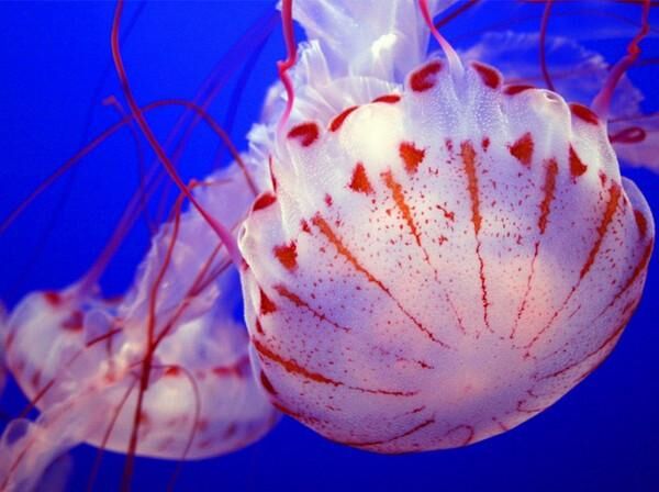3、僧帽水母:僧帽水母是一种看起来很华丽的水母,僧帽水母不是单一的个体,而是由许许多多微小的浮游孢子所组成的一个整体。僧帽水母分布在太平洋和大西洋,栖息在海平面,部份像帆浮在水面上,其余部份则在水底下。它们不能产生动力,随风、水流及潮汐来移动。