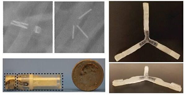 X光图像显示三折的微针结构在肠道内打开前后的状态(左上图);三折结构打开后可以看到其末端上的微针(右图);微针结构的整体大小与硬币的对照(左下图)。