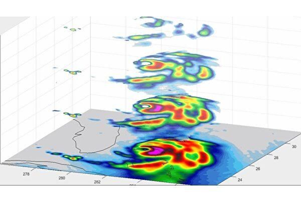 NASA发布了合成的动态三维图,上面各层不同的颜色代表着不同强度的降雨。