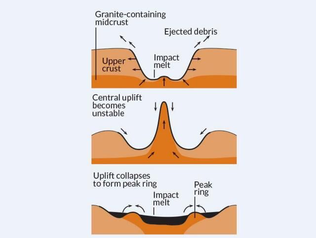 当然这些由于巨大的冲击力而被抬起的物质会直接再次的流入到地球所形成的这个新的坑之中,那么在这里会跟火山口的巨大柱子形成撞击,然后不断的坍塌,这样就形成了所看到的岩石环,而这整个的过程其实时间是比较短暂的,估计也就几分钟之内就已经完成。