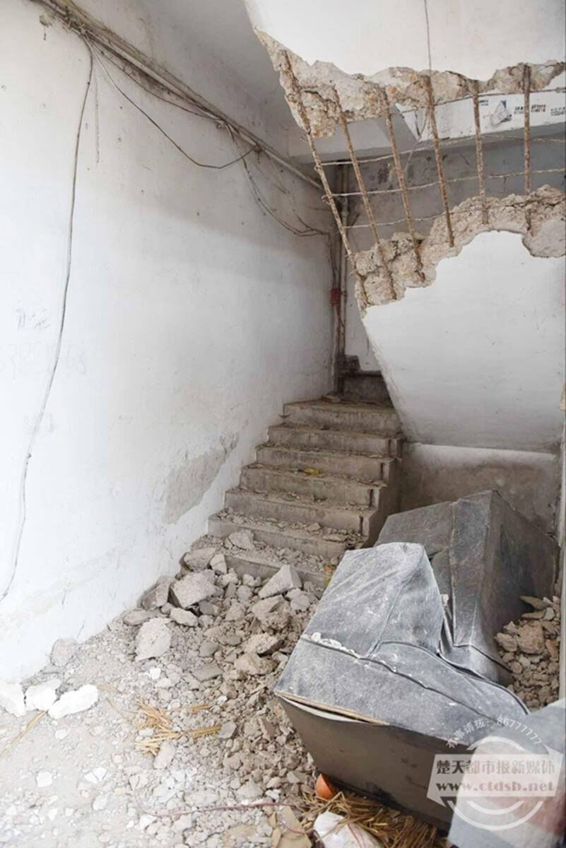 8月5日上午,武汉武昌火车站千家街28号一楼房内,拆迁人员将一楼的楼梯中间部位拆除,露出钢筋。居民杨女士告诉记者,由于和拆迁办没有谈拢赔偿,整栋楼只剩她们一家没有搬走,家里还住着年近80岁的爹爹婆婆,担心上下楼不安全。