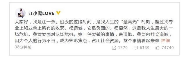 近日,北京市规划和自然资源委员会回应,江一燕别墅属私自改扩建工程,经核实,未取得规划审批手续,由城管部门负责查处。21日,江一燕发文回应近期的别墅事件,表示第一件要做的事情是道歉,“因为个人的行为不当,成为舆论焦点,占用社会资源”。并称因为在跨界的过程中得到了一些认同,忘了自己的本职,之后会回归演员本身,做一个朴实的人。