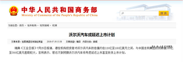 英国《金融时报》日前称沃尔沃中国所有者原计划在年底前让沃尔沃部分业务上市,但因为担心全球贸易战可能会影响这家瑞典公司的估值,将推迟沃尔沃汽车(Volvo Cars)的首次公开发行(IPO)。此前有消息称,沃尔沃考虑在香港和瑞典双上市,估值达到300亿。