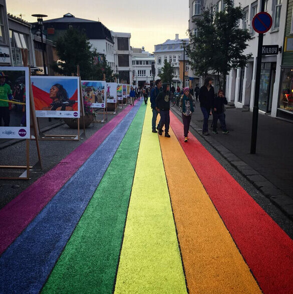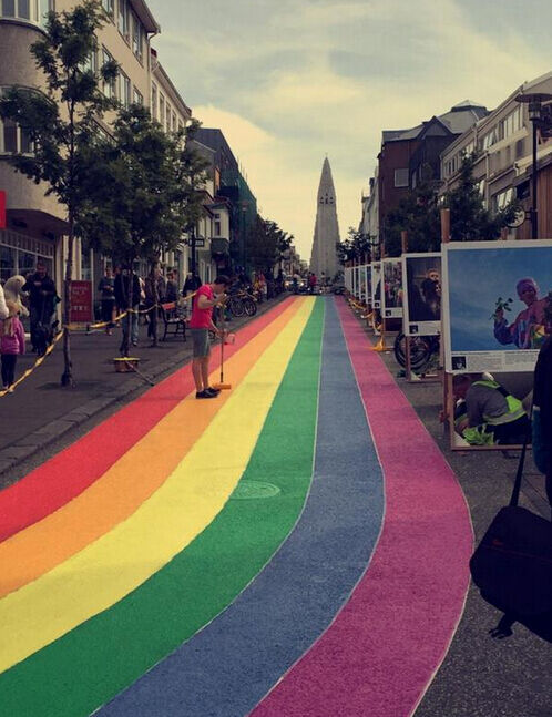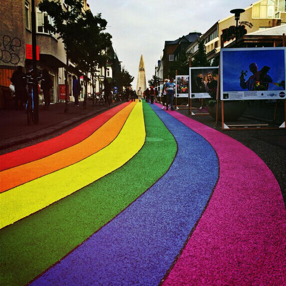 近日作为一年一度城市同性恋游行节日的一部分,冰岛首都维克亚维克中心街道地面被涂成了彩虹色。大量群众走上街头帮助涂刷地面,其中包括雷克雅未克市长DagurEggertsson,他手持颜料刷涂上了黄色的部分。