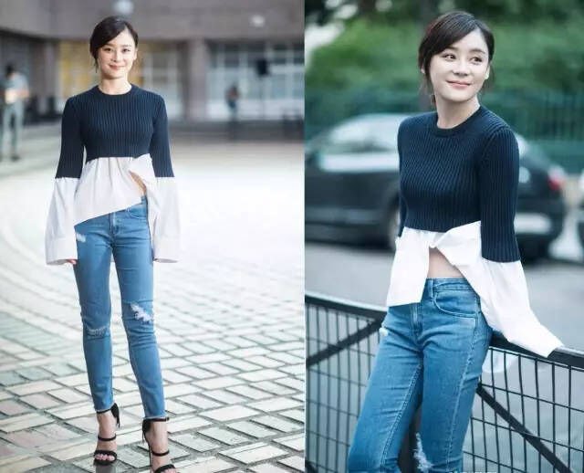 姗姗穿这条阔腿裤,裤腿很宽,长度很长,整体感觉很费布料,很良心,但是即使是高腰穿法也依然拯救不了这条肥裤子犯下的错误,看上去太过拖沓!