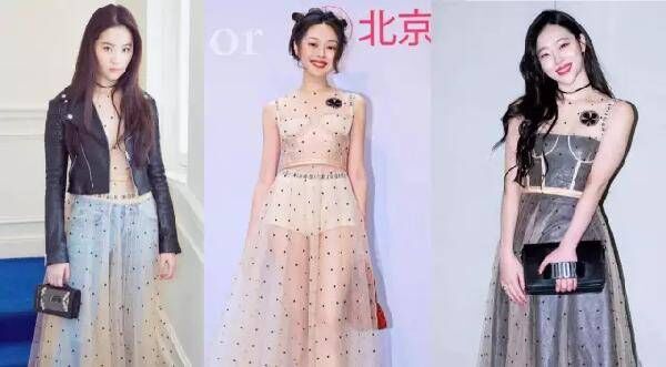 其实三月中旬,醒醒刚好扒过Dior家这条纱裙。裸色 X 波点 X 透视,穿上分分钟变仙女!刘亦菲外搭皮夹克,下半身牛仔裤,算是比较保守的搭配。但晚晚这身前卫的底裤外露+夜店风,恕我无法接受...