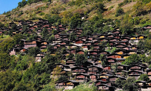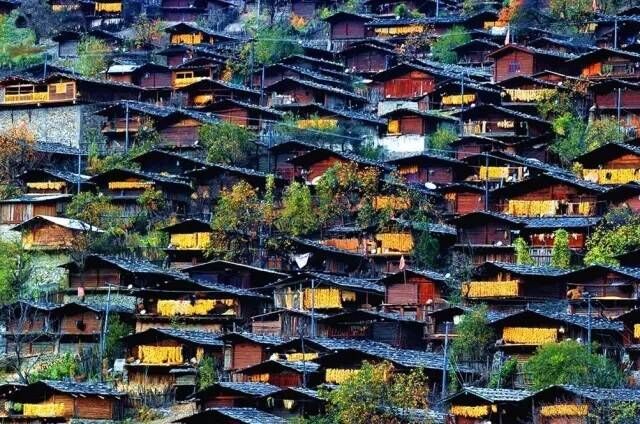 整个同乐村都修建在半山腰上,而且密集程度很高,村子里面的建筑没有砖瓦石头等材料,只有木头,不管是房屋,围栏还是其它都是用木头做的,就连房屋的顶部都是用木板做的,木板上面压上石头做成的屋顶也是这里的特色。