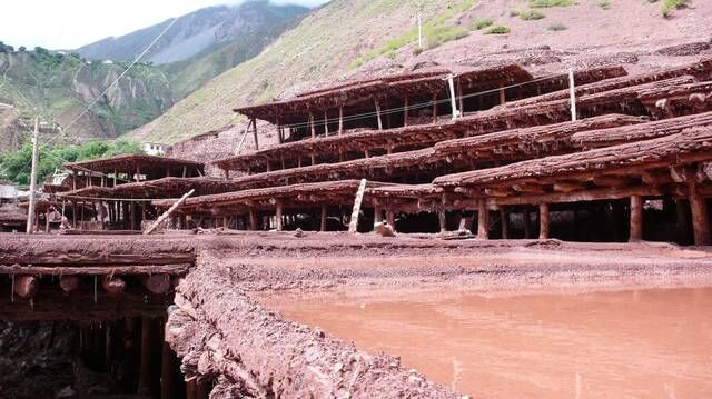 西藏的盐井区域可不是平原地带,而是山区,这里很少有平原,因此当地人依靠自己的智慧,他们用的是高山松木搭建起了一个个不大的晒盐台,这种台子有点像吊脚楼,这里晒盐的水源是附近的卤水,而高山松木可以有效的抵抗卤水的腐蚀。