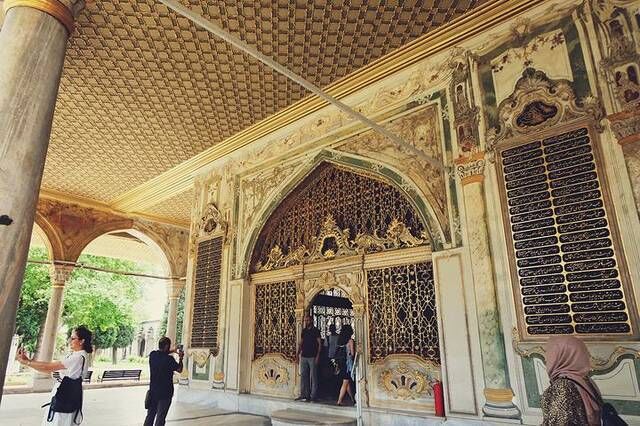托普卡帕宫修建于1454年,整个宫殿分为内廷和外廷,外廷是政府办事的地方,内廷是皇室成员的居所,进入宫殿需要经过三道大门,第一个是帝王之门,门上有关于穆罕穆德苏丹的碑文,也可以说是一段对历史的记载,第二个大门是敬礼门,第三道门是丰饶门,这个是进入皇室核心区域必须要经过的门,也是举行重大仪式的起点。