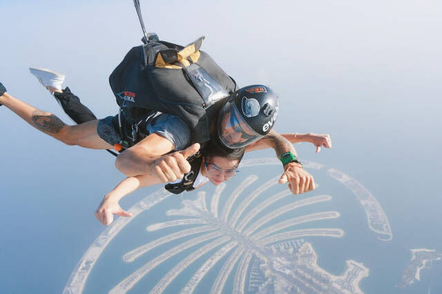 写这篇攻略的时候我看了一下价格,大概是2199AED,这个是棕榈岛跳伞的价格,他们还有其它的玩法,比如去沙漠跳,价格能便宜些,但是棕榈岛体验更好些;