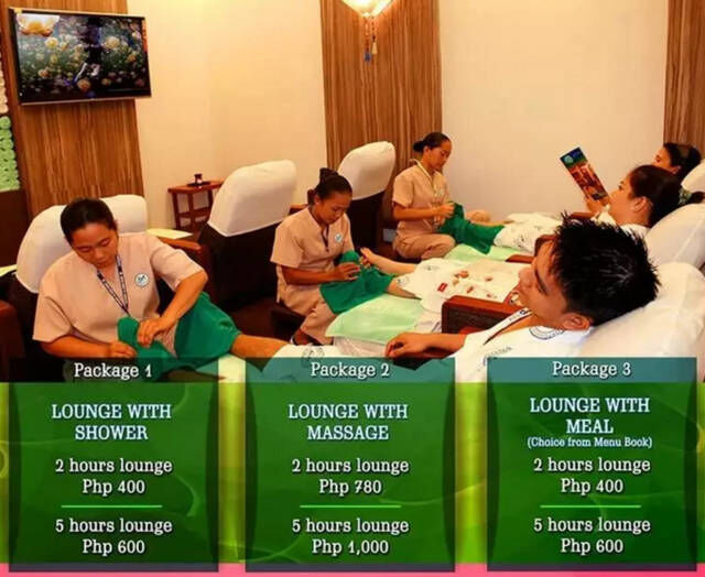马尼拉机场有按摩店,是日本人开的,所以管理方面还是比较有规矩的,普通的服务,一般2个小时是200比索,5个小时是600比索,当然也有升级服务,这个5个小时的费用是4000比索;