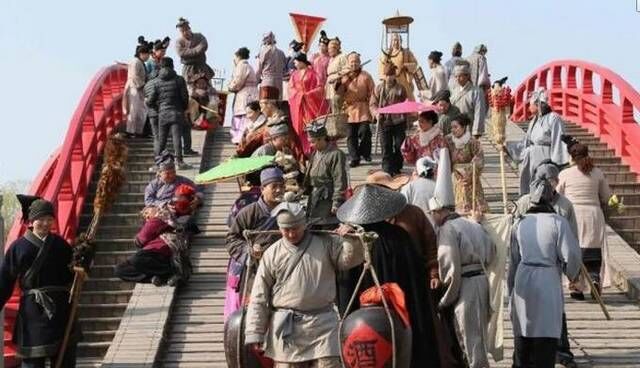 游客进入景区,当你走到虹桥的时候,你就能一览大宋的市井风情了,其实虹桥在清明上河图上也出现过,图上的虹桥不仅能走人骑马,而且桥下还有船只通行;