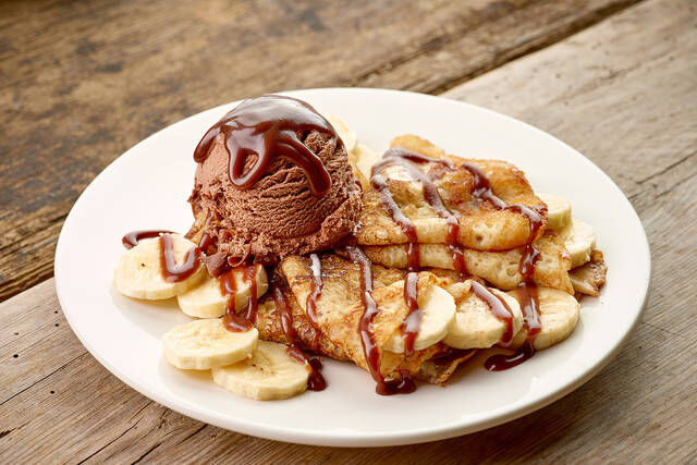 这绝对是那些喜欢甜品的人最爱的美食了,被拉的很薄很薄的一张薄饼上,然后卷些许新鲜的香蕉片,然后撒上糖浆、巧克力酱和炼乳,这绝对是甜品中的极品了,我是很喜欢吃的;