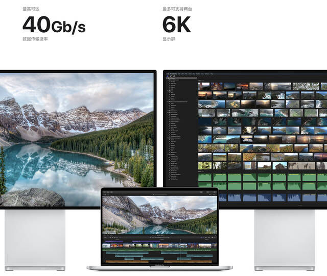 有许多的小细节并没有在苹果的品鉴会上着重的说明,比如外接显示器支持。在新款笔记本的介绍页面与苹果的官网支持文档中,使用了全新的AMD 7nm显卡的新款MacBook Pro 16英寸已经可以支持两台6K显示器外接了。