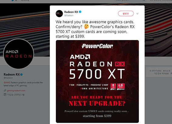 消息来自AMD Radeon Twitter帐户,其中包括使用Power Color设计的横幅图片。