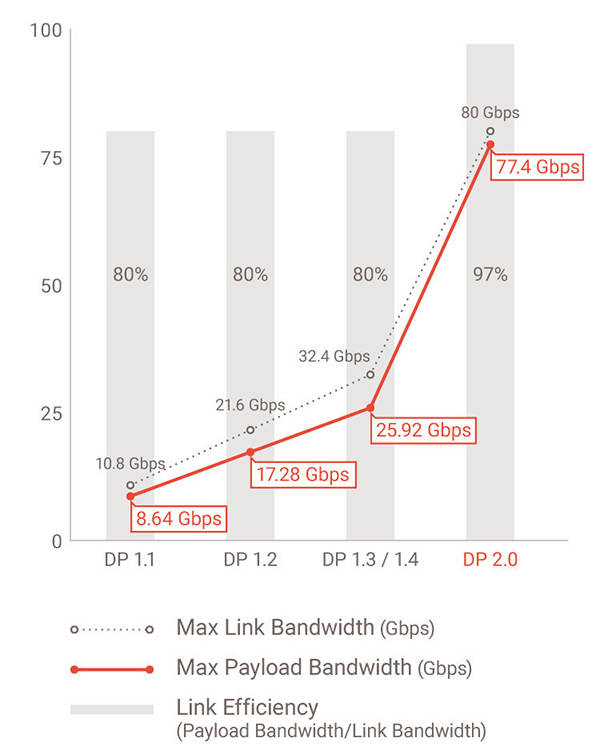 VESA 今天发布了 DisplayPort 2.0 协议,这是自 2016 年 DisplayPort 1.4 协议后首次重大更新。DisplayPort 2.0 可以实现最高 77.4Gbps 的带宽,是 1.4 的近三倍,这意味着可以支持最高 16K 分辨率,更高的刷新率,在高分辨率下更好的 HDR 显示,以及支持多种显示配置。