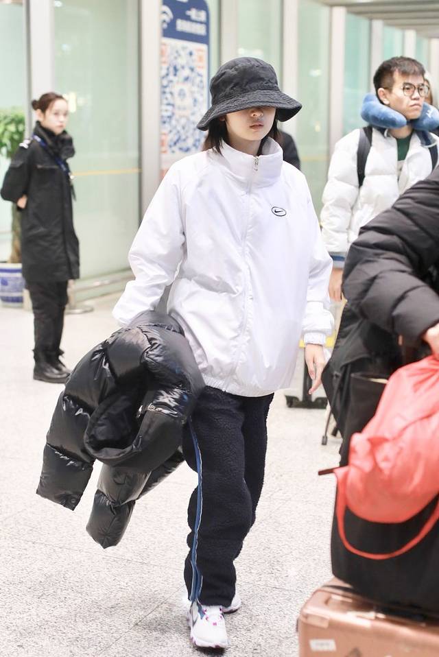 日前,周冬雨现身北京机场,头戴渔夫帽素颜出镜,穿白色冲锋衣搭黑色运动长裤,手里还拿着一件厚棉服,走起路来大步流星,飒爽感十足。