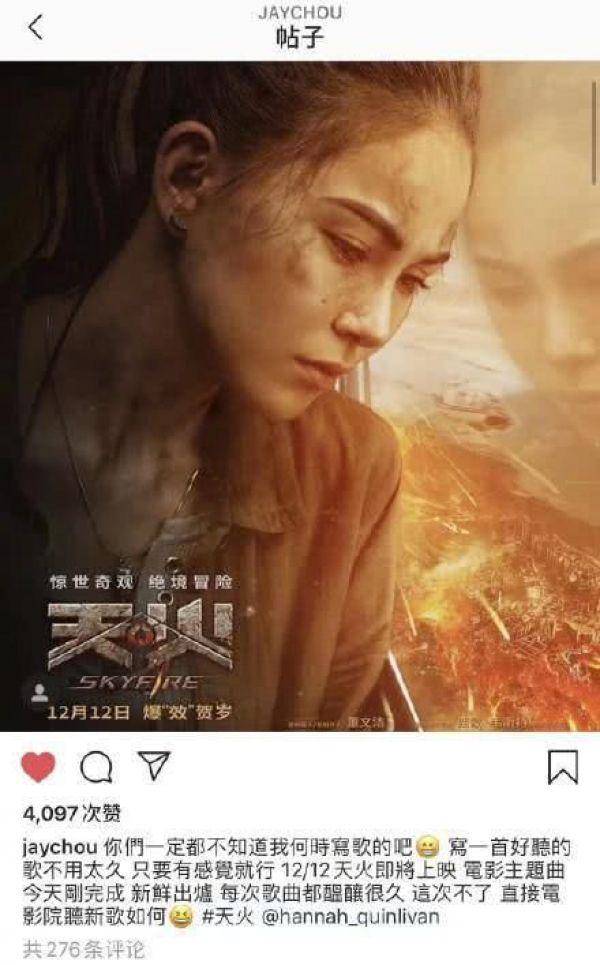 近日,周杰伦在个人社交账号上宣布,自己刚完成了一首新歌,而这首新歌正是老婆昆凌主演的新电影《天火》的主题曲,12月12日就会在电影院上映,到时候大家就可以在电影院中听到他的新歌了。这让不少粉丝感叹,还是大嫂管用啊,毕竟周董已经好长时间都没有出新歌了,大家都等怕了。