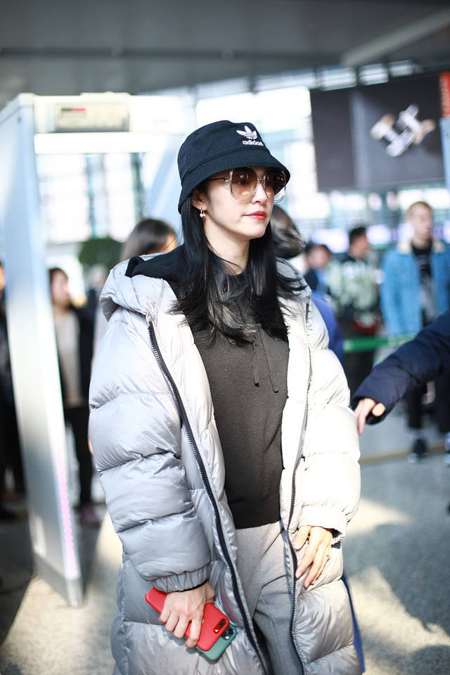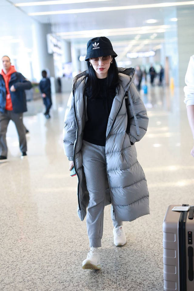 姚晨毕竟已经40岁了,所以在机场现身时的私服几乎都没有什么亮色的。长款羽绒服保暖舒适,将前面的拉链拉开也能够增加气场。内搭选择了与帽子同呼应的黑色,不仅能在视觉上显瘦,还能与肤色对比,显得皮肤更加白皙。下身搭配灰色的运动裤,在追求舒适的同时还能增加随意感和亲和力,简单中不失大方。