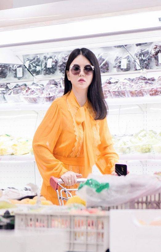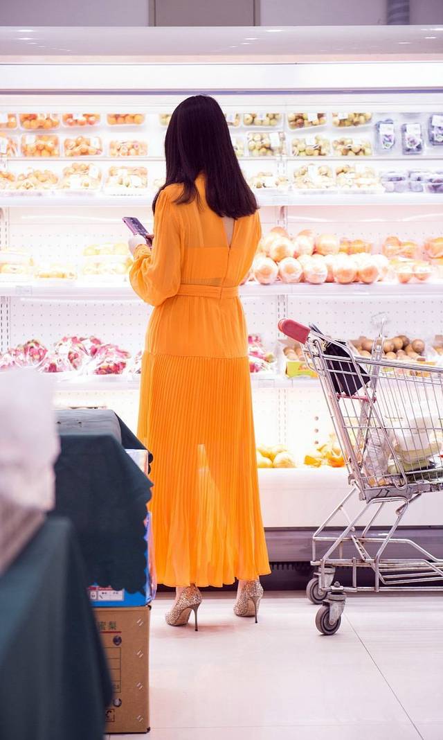 当天李湘面对着的蔬菜区一致挑挑拣拣,看起来很纠结,背影纤细窈窕,前凸后翘,长发披肩低头看手机,画面完全没有以前的油腻感,给人满满的清新女神范。