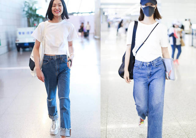 ♦简单的白色T恤和牛仔阔腿裤搭配时,像刘雯的牛仔款,毛边裤脚翻边穿搭,短款T恤微微露腰。或者是上图二中极简的阔腿款,高腰收腰造型,日常出街选搭黑色的挎包和白色休闲鞋出街,整体造型简约干净。