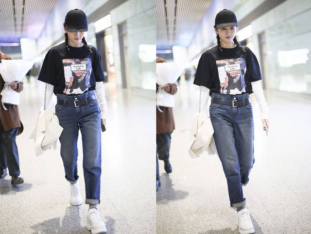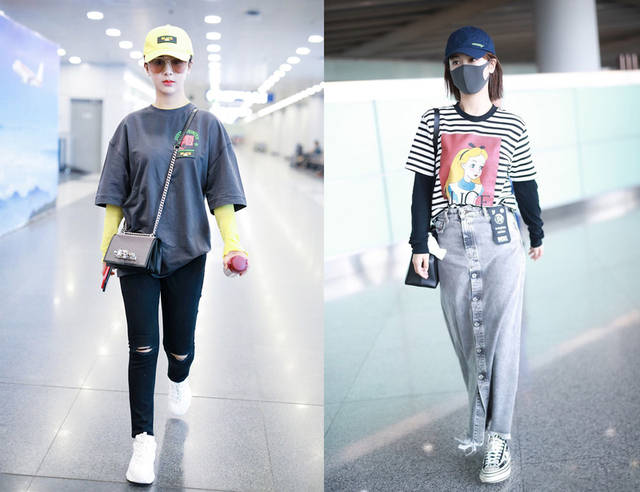 除了王鸥,杨紫今年更是偏爱T恤的叠加造型,她首先穿了一种黄色长袖T恤+灰色短T恤的造型,此外,还搭配和黑色破洞裤和小黄帽,造型看起来清新有范。杨紫还有一身条纹短T恤配黑色长袖T恤的造型,配牛仔裙穿,很新潮文艺。