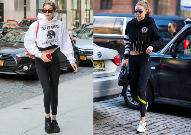 ♦短款的卫衣和紧身运动裤搭配,休闲舒适的穿搭,白色短款卫衣和黑色裤装搭配,或者是黑色卫衣搭配黑色运动裤,包包的颜色红色是推荐的色调,身高在160以上的小仙女都是推荐选择搭配,运动鞋的颜色多种选搭。