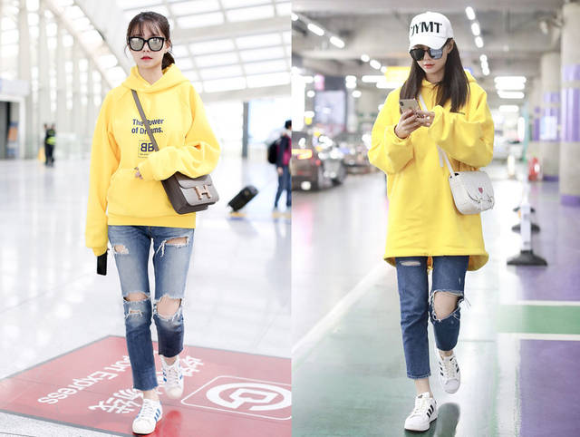 除了宋祖儿,沈梦辰也是一位喜欢亮黄色卫衣帽衫的Girl,她首先是穿了一件带字母的亮黄色帽衫,配上破洞牛仔裤和小白鞋,看起来妥妥的是明媚个性少女一枚。此外,沈梦辰还有一件长一些的亮黄色帽衫,更有街头不羁风。