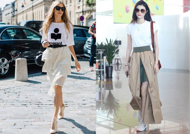 ♦白色T恤在日常生活中的选搭,在选搭的时候,白色T恤和裙装组合,上图一中的双色拼接长裙,文艺范的造型选搭。日常休闲简单的穿搭,白色T和红色条纹裙组合,简单的色调组合,简单干净的造型出街。