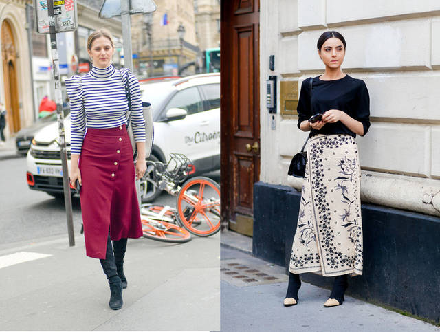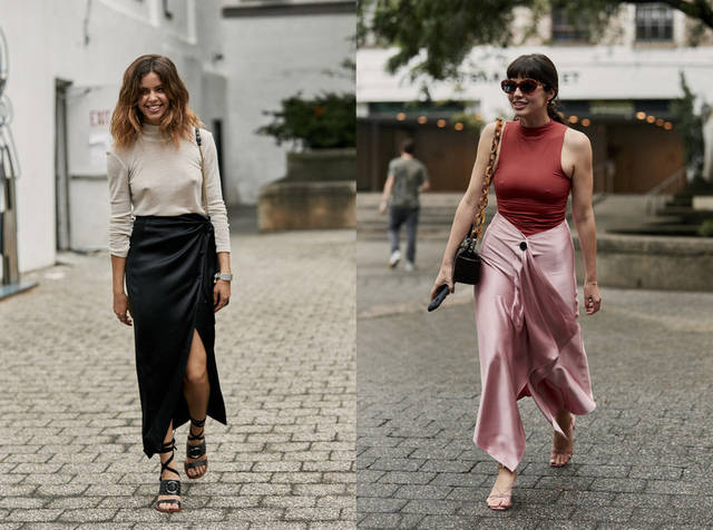 丝质面料的围裹式半裙是超级受欢迎的款式之一,看起来高级的缎面配上不规则和开叉,真的是无比的时髦有范,而且,缎面还给人清凉的感觉,很适合春夏穿。颜色上,经典酷帅的黑色或是甜美不失优雅的茱萸粉都不错。