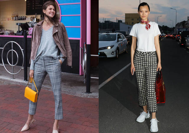 ♦九分款的裤装,在春季选搭时是露脚踝的推荐款式,上图中简单的灰色格纹款九分裤搭配灰色薄针织,简单的色调选择黄色的包包组合搭配。或者是灰色格纹裤搭配白色上衣,选搭白色鞋子,红色的包包推荐搭配。
