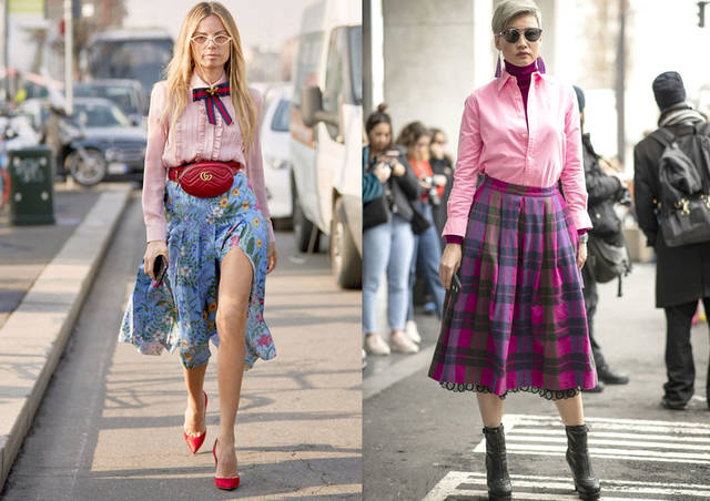 ♦粉色的衬衣选搭裙装时,有多种搭配选择,上图一中粉色衬衣(小花边)搭配天蓝碎花裙(侧开叉),选搭红色腰包组合。还有就是选择简约款粉色衬衣和紫红格纹裙搭配,成熟气质的穿搭,包包和靴子选择黑色。