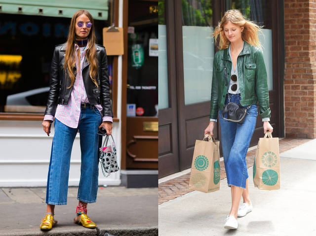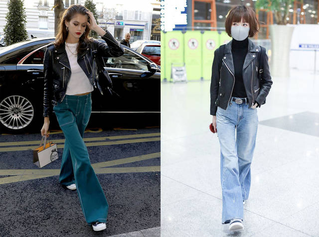 首先是短皮衣配阔腿裤,潮人们春季最喜欢用超短款皮衣配及膝阔腿裤了,经典的超短皮衣莫过于黑色了,黑色短皮衣酷帅势不可挡,配上复古蓝或者是牛仔蓝的阔腿裤,上身再来一件基础的黑白T恤,整身穿搭酷帅又极为耐看。
