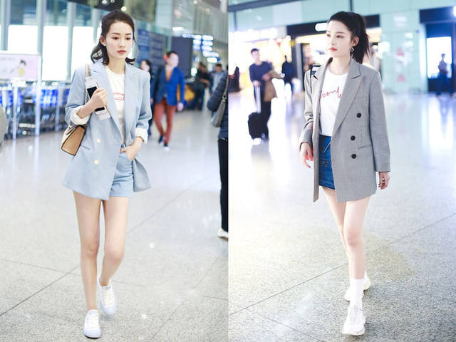 除了张天爱,李沁最近也是超喜欢西装+短裤的穿法,她贡献了两身不同的穿搭。第一身是天蓝色西装配天蓝色短裤,在此基础上加上白Tee和小白鞋,造型清凉高级。第二身是格纹西装牛仔短裤,同样搭配白T恤和白鞋,造型复古耐看。